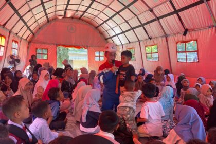 Aceh Tamiang, -SUARA anak-anak bernyanyi dengan riang gembira terdengar dari jalan utama…