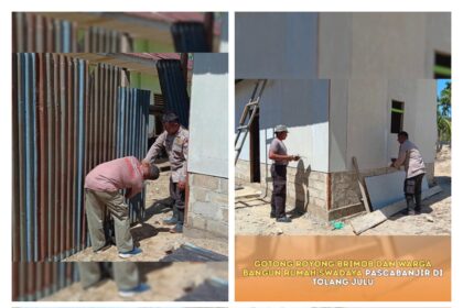 Gotong Royong Brimob dan Warga Bangun Rumah Swadaya Pasca banjir di Tolang Julu