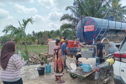 Aceh Tamiang, -AIR mengalir deras dari selang truk tangki berukuran 2,5 sentimeter.…