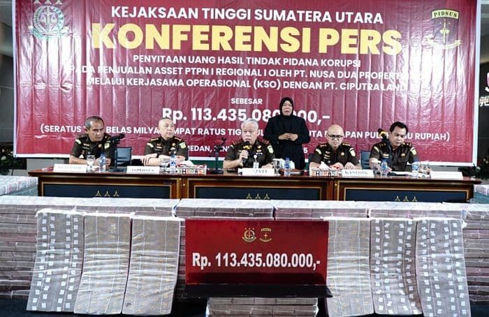 Medan,-Kejaksaan Tinggi (Kejati) Sumatera Utara (Sumut) menyita uang pengganti (UP) kerugian keuangan negara senilai Rp113 miliar dari kasus dugaan korupsi penjualan aset PT Perkebunan Nusantara I (PTPN I) Regional I…