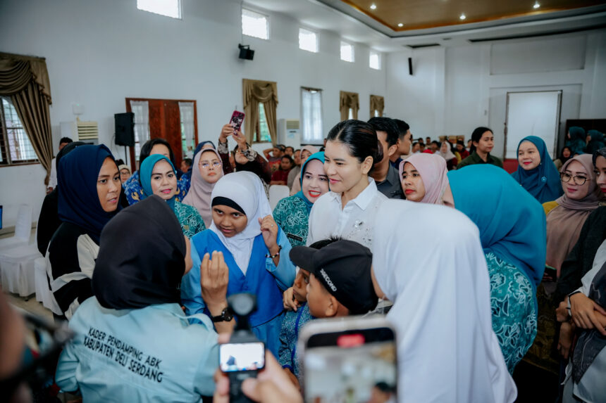 Deliserdang,-Ketua Tim Penggerak Pemberdayaan dan Kesejahteraan Keluarga (TP PKK) Provinsi Sumatera Utara, (Sumut) Kahiyang Ayu memberikan bantuan alat bantu dengar (hearing aid) kepada penyandang disabilitas.