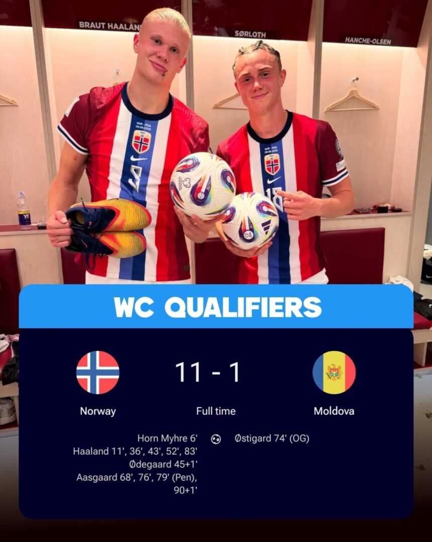Oslo,-Timnas Norwegia membantai Moldova dengan skor 11-1 pada laga kualifikasi Piala Dunia 2026 di Stadion Ullevaal, Rabu (10/9/2025). Kemenangan ini semakin mendekatkan Norwegia ke putaran Piala Dunia pertama mereka dalam 27 tahun terakhir.