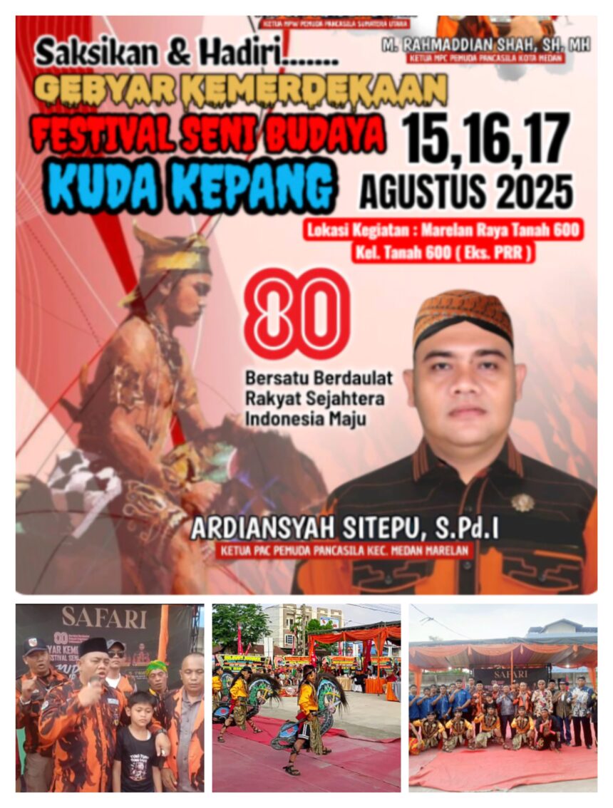 Marelan – Dalam rangka gebyar kemerdekaan RI ke 80 tahun, Pimpinan Anak Cabang Pemuda Pancasila (PAC.PP) Medan Marelan mengadakan Festival Seni Budaya Kuda Kepang selama 2 hari di Lapangan Tanah 600 Marelan.Jumat (15/08/2025).