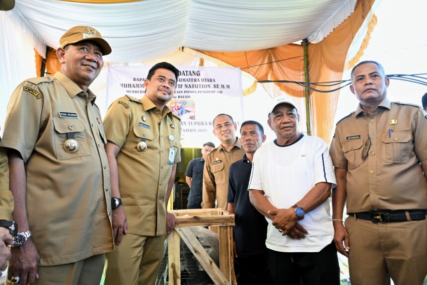 Langkat,- Gubernur Sumatera Utara (Sumut) Bobby Nasution meninjau pengerukan sedimen waduk di Kelurahan Pekan, Kecamatan Tanjungpura, Langkat, Senin (21/7/2025). Pada peninjauannya tersebut, Ia juga menyerahkan bantuan dua buah mesin pompa penghisap air.