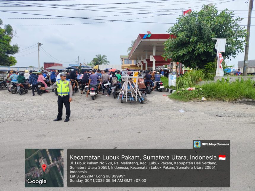 Deli Serdang – Antrean panjang kendaraan di Stasiun Pengisian Bahan Bakar Umum (SPBU). Kemacetan yang ditimbulkan akibat penumpukan kendaraan pengisi BBM yang di sebabkan stok yg tidak mencukupi ini kerap mengganggu arus lalu lintas, terutama di jalur-jalur padat. Menanggapi situasi ini, Satuan Lalu Lintas (Satlantas) Polresta Deli Serdang dengan sigap menerjunkan personelnya untuk mengatur kelancaran lalu lintas. Minggu (30/11/2025).